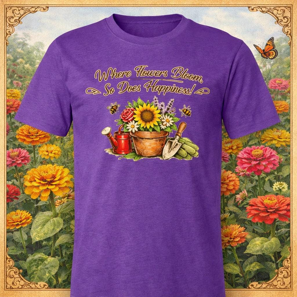 .:Custom art created in Brenda's garden studio.: 4.2 oz., 100% Airlume combed and ring spun cotton, 32 singles.: Retail fit, unisex sizing.: Shoulder taping, side-seamed.: Pre-shrunk.: Print Method: DIGISOFT®